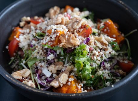Zwiebelringe, Spinat bzw. Salat in die Bowl geben, Quinoa und Kürbiswürfel darauf verteilen. Den Feta oder Ziegenkäse zerbröseln. Das Dressing gut verrühren und über die Bowl geben. Zum Abschluss die Kürbis- oder Walnusskerne darüberstreuen. Genießen!