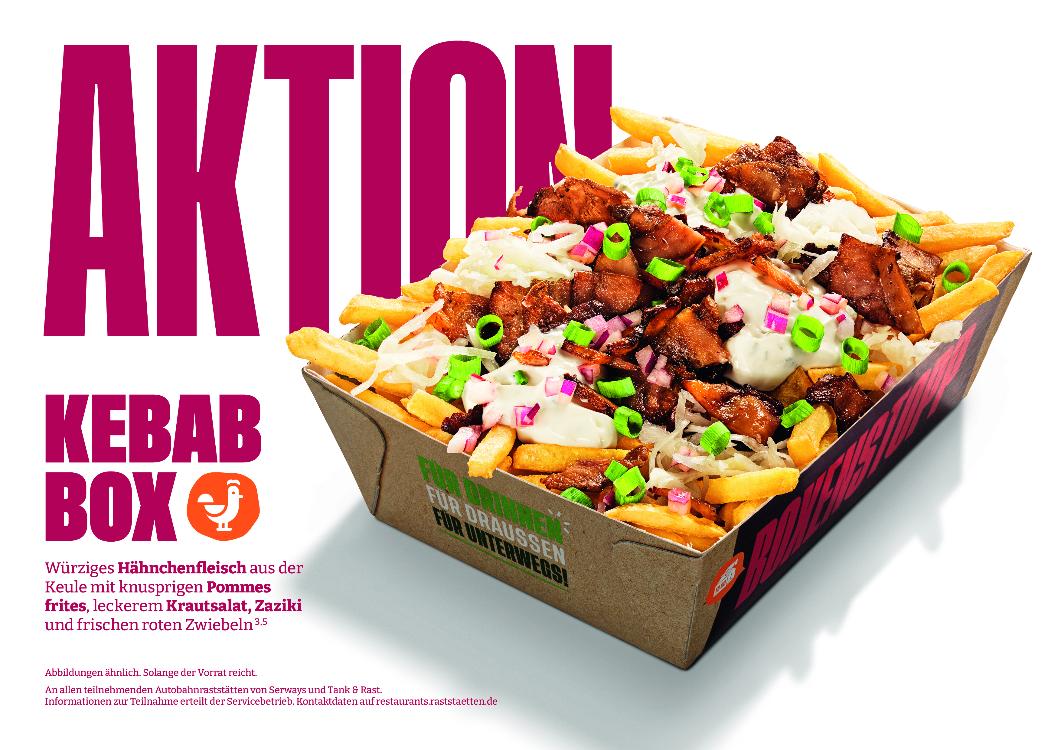 In den Raststättenrestaurants steht ab sofort die Kebab Box im Mittelpunkt. Das neu kreierte BoxenStopp-Gericht vereint würzig mariniertes Hähnchenfleisch aus der Keule mit knusprigen Pommes frites, knackigem Krautsalat, Zaziki und roten Zwiebeln. So entsteht ein Gericht, das die typische Aromatik eines Kebabs aufgreift und zugleich auf die Bedürfnisse von Reisenden zugeschnitten ist: schnell serviert, einfach zu verzehren und eine vollwertige, warme Mahlzeit für die entspannte Pause unterwegs. Der orientalisch inspirierte Snack eignet sich auch ideal zum Mitnehmen und ist ab sofort zum Aktionspreis von 9,99 Euro erhältlich.